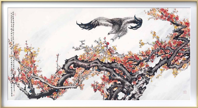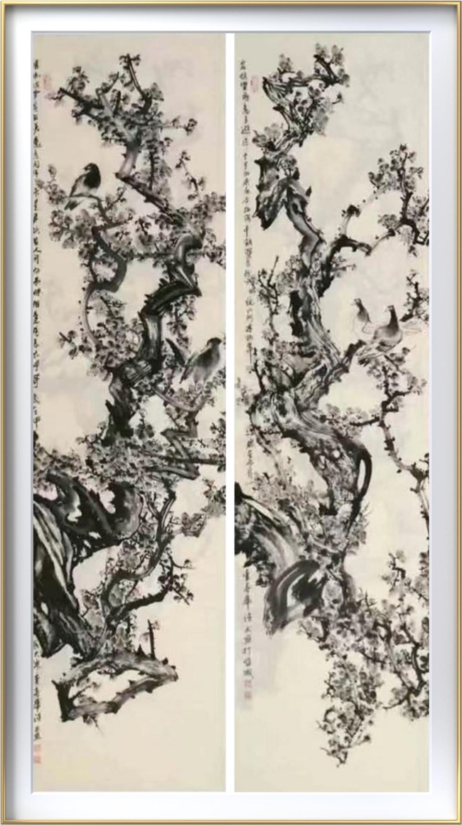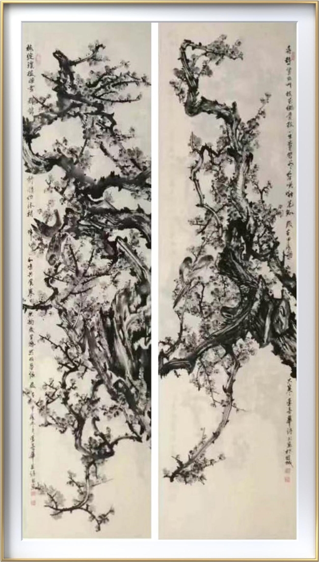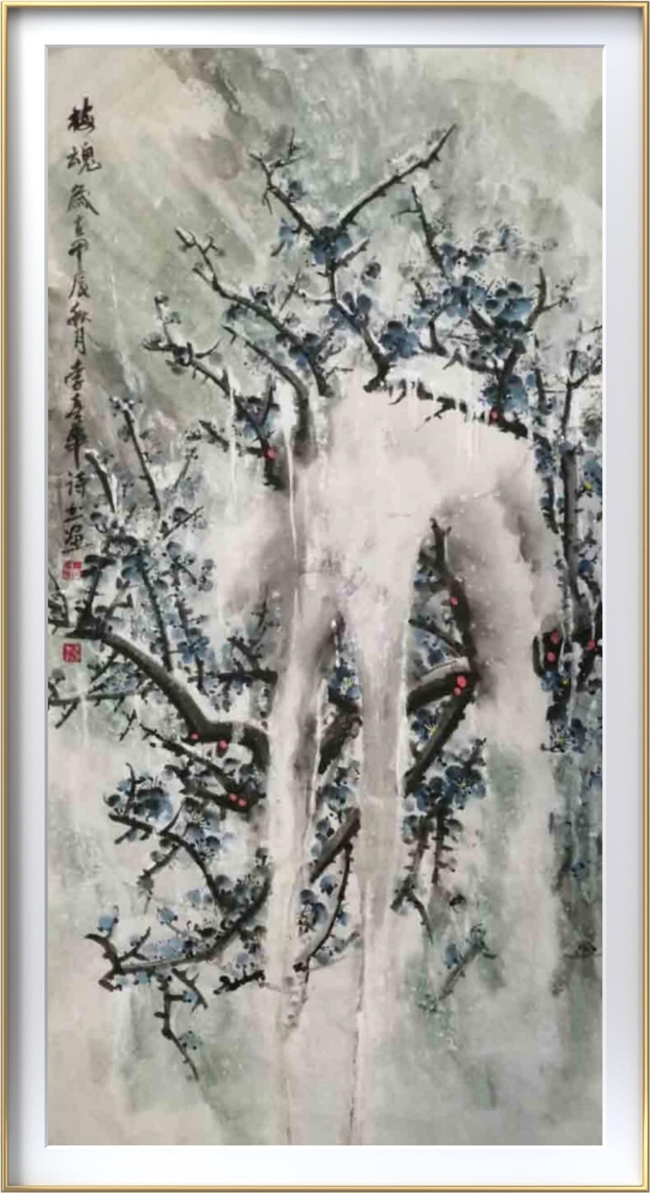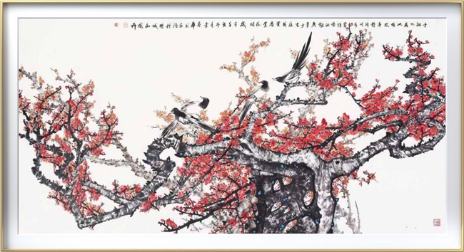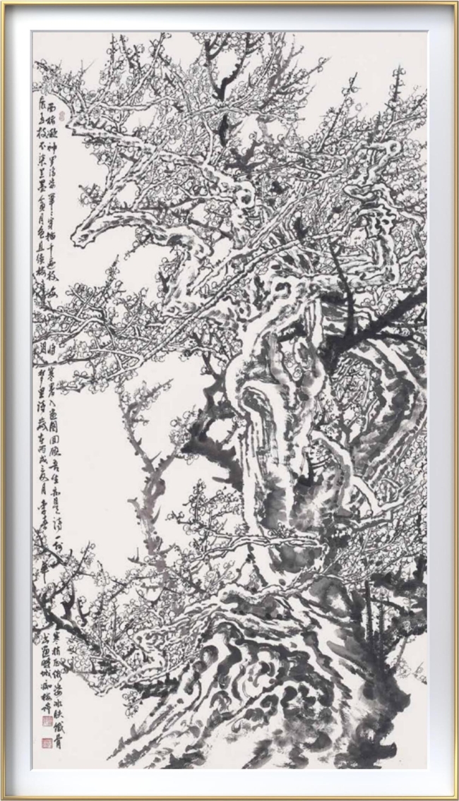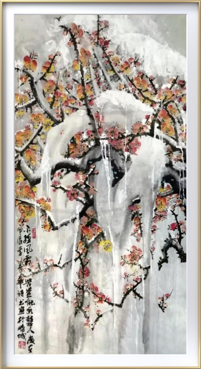 李春华老师尤钟情梅画创作,梅花位居“四君子”之首,是传统花鸟画之热门题材。笃研文人画之三昧,秀婉与古朴兼具,苍茂中溢清雅,传统文人画之理趣与当代人文精神交融,别具高格,故获各界人士钟爱而膺“岭南——枝梅”之美誉。李春华老师长期孜孜不倦于新技法之创新与新意境之开拓,他深研当代名家风格,最擅用冰天雪地与浓霜寒湍之背景衬托梅花之繁荣,不唯尤显冷艳,更呈绚烂。他从梅花的气节中体悟到艺术创新的多元性,终于在恪守古法、尊崇传统的主旨上,专就“骨法用笔”苦心探索,用纯熟的篆隶行草等书法融入画笔,彰显梅花的虬枝铁骨,刻画花萼之郁勃生机,笔墨更凝炼含蓄;篇幅虽不宏大,而气势充沛,气象庄穆清逸,体现了书画同源合的民族艺术之独特美学理念。再者,也提升了梅花的审美意蕴,寄寓了对顽强不屈的民族精神的赞美。他的梅花佳作,有的花朵疏密相间;以流畅爽利之行草笔法勾勒主干,别具丽质丰神;有的枝干以浓墨塑造屈曲盘错之下部老干,苍虬劲健之姿跃然纸上,书法之骨力昭然;有的活翻多姿,墨色极富变化,动静相谐,相映成趣,呈现出古朴疏朗之态,亦殊堪玩味。赏李春华之梅花作品,其成功之处可概括之为“道”法自然、“继”乎传统、“融”入书法、“遵”于中庸。盼其创作更加丰盛,更具独特的不流时俗之风采。