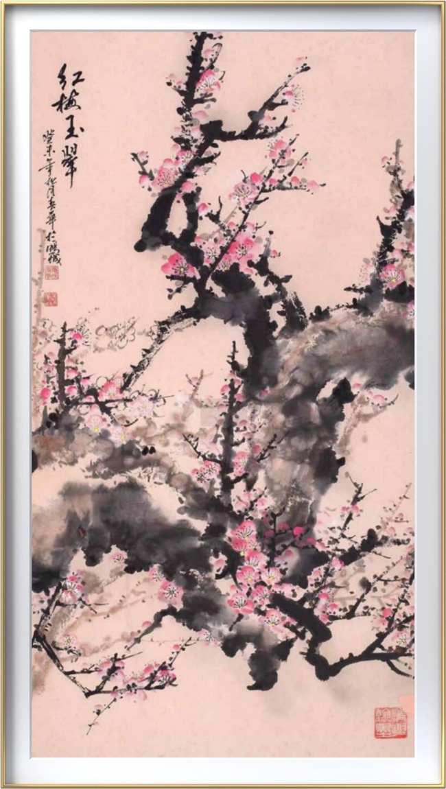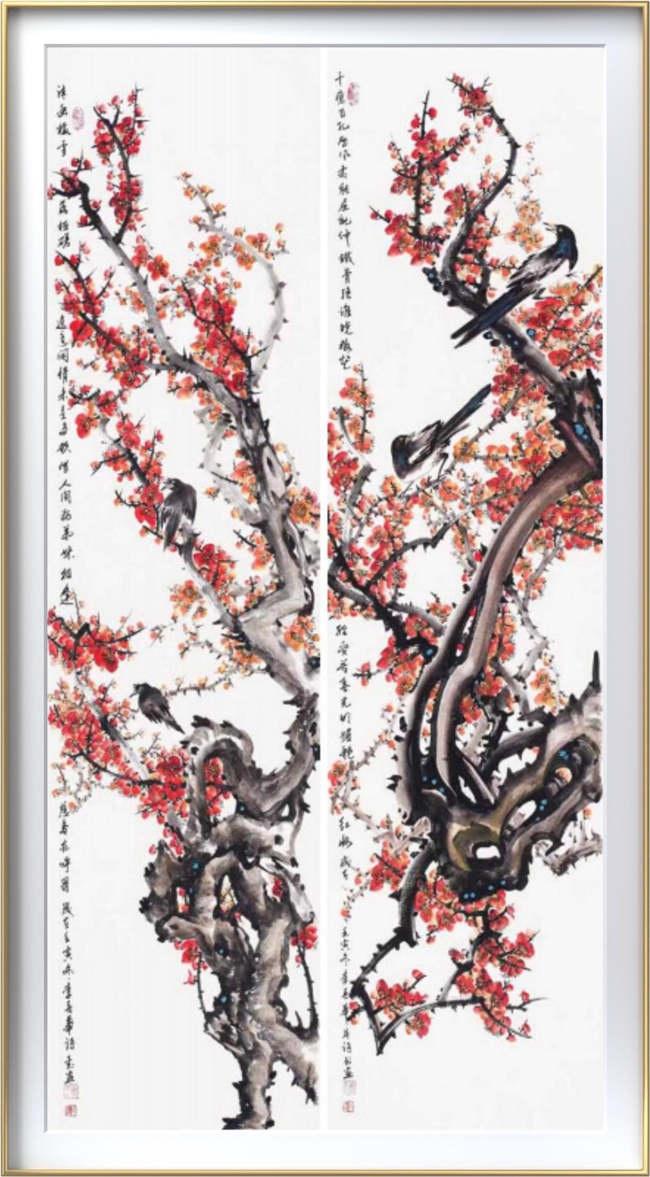 前无古人后没来者的梅花之神韵,从中体悟到艺术创新的多元性,终于在恪守古法、尊崇传统的主旨上,专就“骨法用笔”苦心探索,用纯熟的篆隶行草等书法融入画笔,彰显梅花的虬枝铁骨,刻画花萼之郁勃生机,笔墨更凝炼含蓄;篇幅虽不宏大,而气势充沛,气象庄穆清逸,体现了书画同源合—的民族艺术之独特美学理念,再者,也提升了梅花的审美意蕴,寄寓了对顽强不屈的民族精神的赞美。且看题诗“春归笑隐绿丛中”之红梅,主干呈倒“人”字形兀立,中部与顶部枝岈纵横穿插,敷以或浓或淡之花朵,疏密相间;以流畅爽利之行草笔法勾勒主干,别具丽质丰神。细加品赏,但见整株主干都用淡墨,唯下部稍施浓墨苔点,备显浑穆苍古;而顶部亦有两三株浓墨细干,横斜伸延,与淡色主干相映,既觉活泼秀逸又生趣盎然。“傲骨生辉图”则另呈面目,以浓墨塑造屈曲盘错之下部老干,苍虬劲健之姿跃然纸上,书法之骨力昭然;唯左面一枝,用淡墨斜伸上空,与前者形成鲜明对比,既平衡了布局,亦增添了空灵秀逸之神韵。另三幅皆属狭长画幅,取上下走势,却造型各异;“绿梅图”似苍龙从空而降,活翻多姿,墨色又极富变化。整幅作品以淡雅清疏之绿梅,衬托极具动感之主干,动静相谐,相映成趣,而其余两幅均呈古朴疏朗之态,亦殊堪玩味。