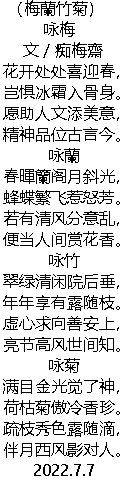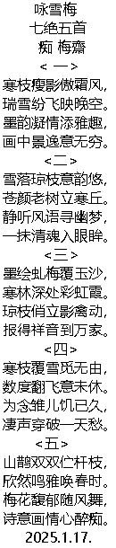 李春华老师的梅花作品在书画领域具有很高的评价和认可。他的梅花作品不仅展现了梅花的高雅和优美,更通过笔墨的运用和构图的安排,表达了梅花所代表的坚韧、傲骨、不屈不挠的精神。在李春华老师的梅花作品中,他运用了熟练的笔墨技巧和独特的构图方式,将梅花描绘得栩栩如生,如诗如画。他注重细节的刻画 , 让人们看到了梅花的形态、花瓣、枝干等细节,感受到了梅花的清新和优雅。同时,他还会通过画面的渲染和构图的安排,让人们感受到梅花在寒冬中的坚韧和生命力。此外,李春华老师的梅花作品还体现了中国传统文化中的一些重要思想。例如,梅花被视为一种傲骨、清高的象征,这种精神与中国传统文化中的“君子之风”有着密切联系。同时,梅花也代表着一种淡泊名利、追求内心世界的精神,这种精神与中国传统文化中的“道家思想”也有着相似之处。总之,李春华老师的梅花作品是一种具有独特魁力和艺术价值的中国传统艺术形式,它不仅展示了梅花的美丽和神韵,更表达了画家对梅花精神的崇敬和追求。这些作品体现了中国传统文化中的一些重要思想,值得我们深入欣赏和传承。