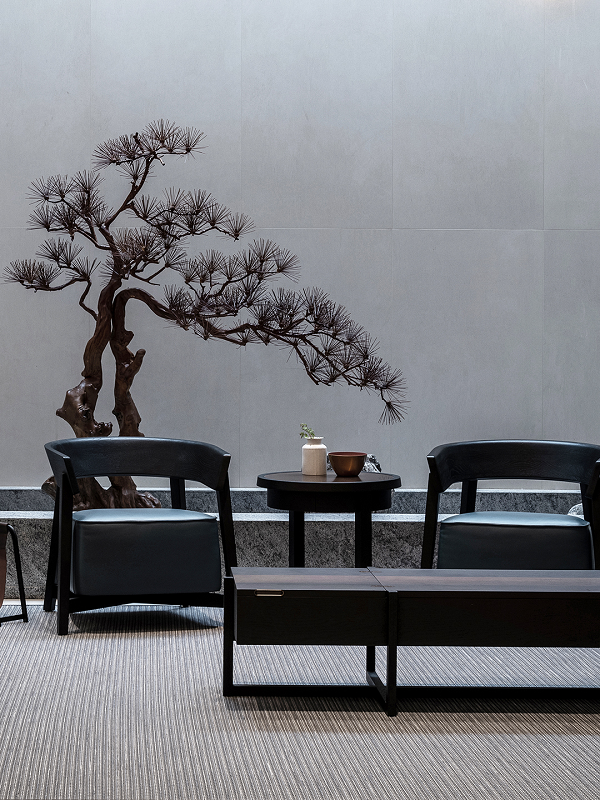 龙井扶手椅改良自中国圈椅,液态高分子定型棉坐垫带来类沙发的舒适坐感,木质靠背以温润弧线模拟“执子之手”的依托,悄然唤起家族记忆中的安定感;