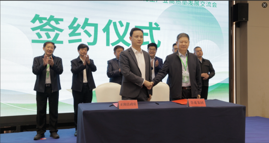 会议现场同时完成两项重要签约:正阳县政府与鲁花集团就高油酸花生全域发展战略合作签约;正阳农高服、正阳鲁花、中亿正花就打造10万亩高油酸花生优质种植签约。鲁花集团决定把正阳鲁花工厂作为高油酸花生油加工基地,以政企协同与优质产地布局,巩固产业链源头的优质原料供给,打通地方一二三产业融合升级,带动农民增收,并进一步释放我国优质油料自给能力提升的潜力。正阳县委书记刘磊评价称,鲁花集团高油酸花生榨油生产线的落地,是“正阳花生产业发展里程碑式的重要事件”。