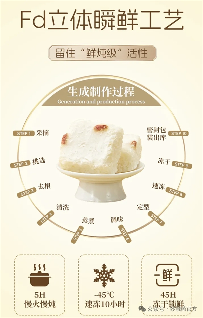创新工艺,以科技锁住活性。妙融燕突破传统炖煮技艺,独创“低温鲜炖”工艺。通过精准将炖煮温度控制在75℃,并采用“炖煮前双重灭菌去腥”的独家技术,最大限度地保留了燕窝酸与银耳多糖等核心活性营养成分,实现了滋补效能与纯净口感的完美统一。