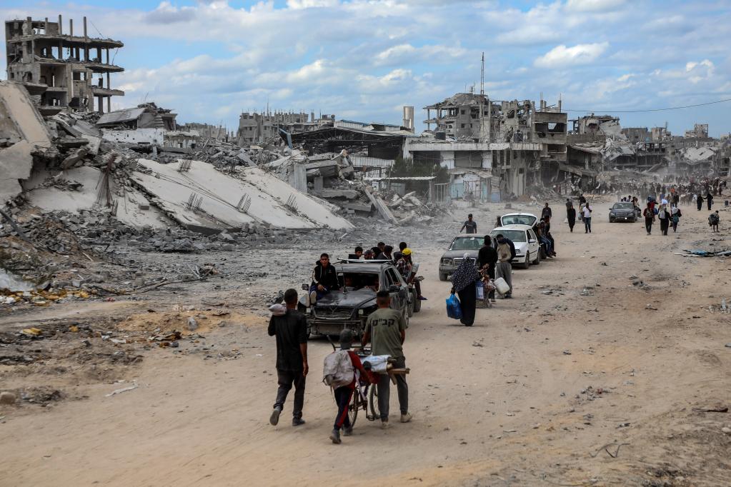 10月12日,在加沙地带南部汗尤尼斯,重返家园的巴勒斯坦人走过严重受损的建筑。新华社发(里泽克·阿卜杜勒贾瓦德摄)