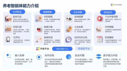 为推动智慧养老场景的多元化落地,萤石养老智能体面向养老合作伙伴全面开放技术能力。提供针对养老设备与服务的定制化打包组件,简化开发对接流程;支持在萤石基础算法上,叠加自有算法共同训练垂直场景专用模型;依托亿级设备接入平台提供高稳定性、高并发技术支撑;单独开放养老算法、声音克隆等原子能力,便于合作伙伴根据实际需求定制化开发,携手构建丰富多元的养老服务生态。