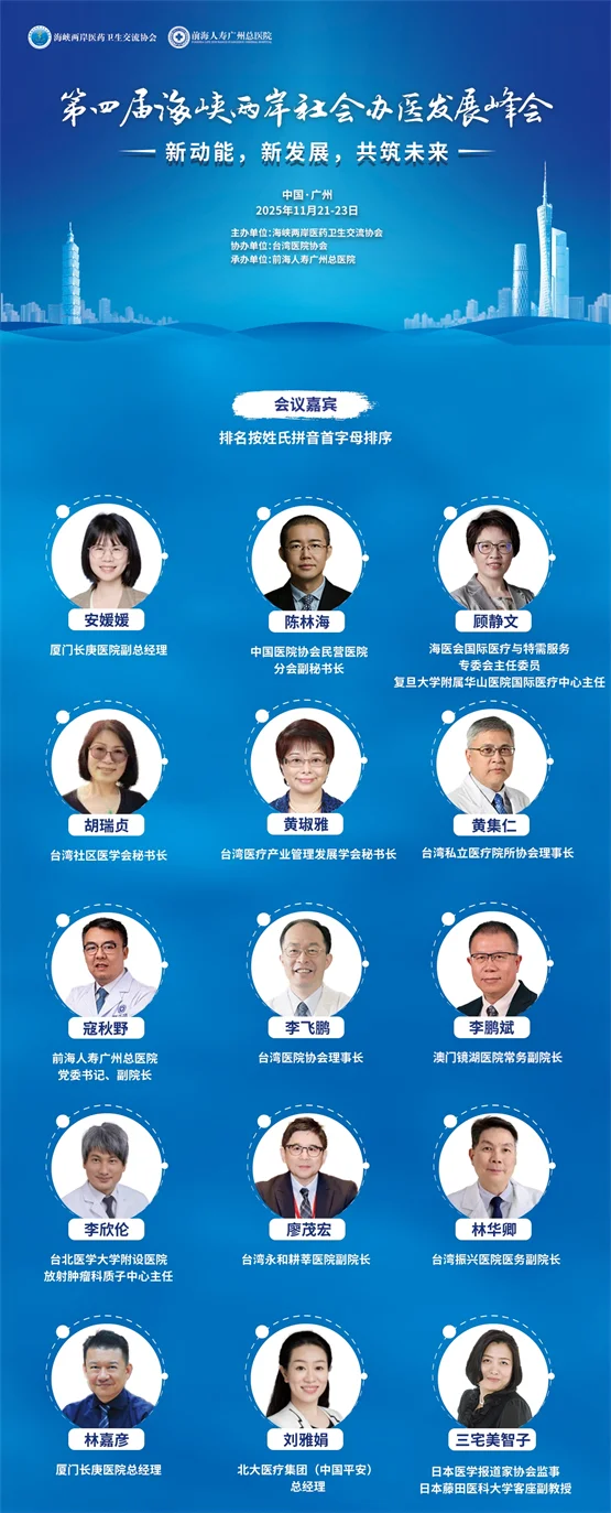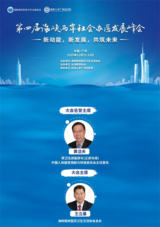由海峡两岸医药卫生交流协会主办、台湾医院协会协办、前海人寿广州总医院承办的第四届海峡两岸社会办医发展峰会拟定于2025年11月21—23日在广州举办。