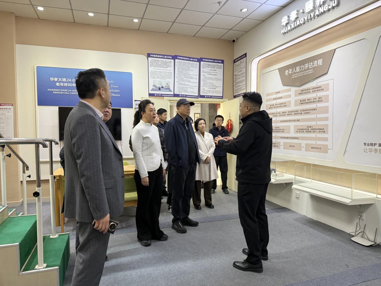 调研组深入成都市长期护理保险定点服务机构——双流华孝大德养老服务有限公司进行实地考察。该机构是由市福彩资金和双流区政府公共财政全额投资的公建民营养老机构。机构占地约1.3万平方米,机构入住失能、半失能长者320余人,配备护理人员78人、行政后勤40人、医务人员13人,作为成都长护险试点实践的基层样本,该机构全面展示了在长护险政策赋能下的运营模式、服务创新与综合成效。机构内设医务室,包含诊疗室、康复室、艾灸室、营养科等区域,提供常见病诊疗、日常健康管理及中医养生服务,实现医养结合,同时,机构积极构建“无围墙”养老模式,实现社区养老与机构养老资源高效互补,将机构专业照护与康复资源向社区延伸,为更多长者提供便捷服务,实现了机构、社区与居家养老的资源互补与高效协同。
