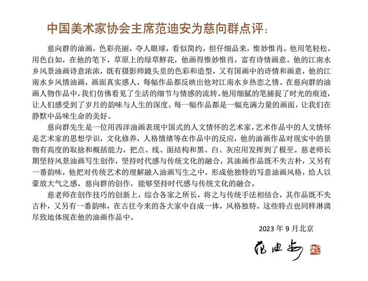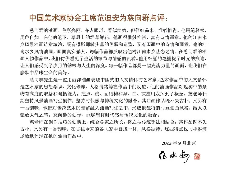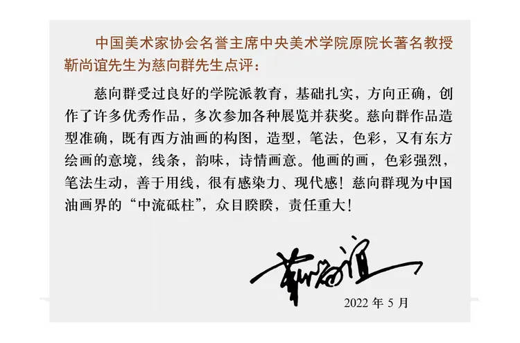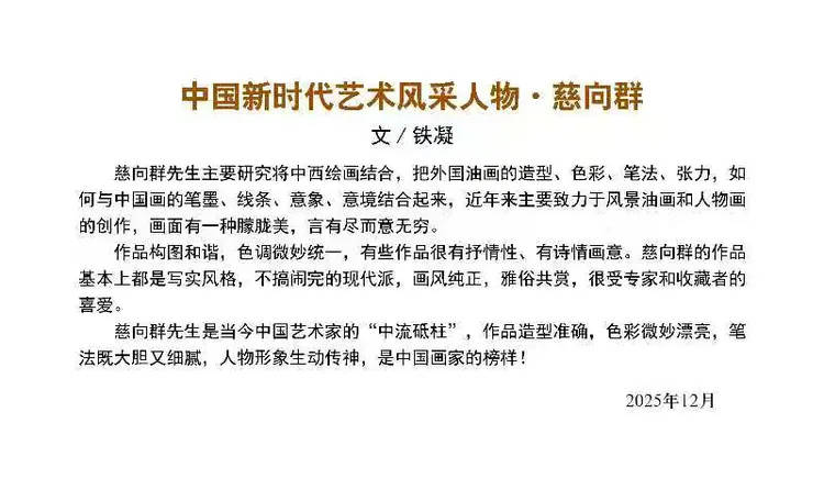 慈向群,男,著名画家、设计家、国家一级美术师。1959年出生于美术世家,1984年毕业于清华大学美术学院(原中央工艺美术学院),师从于张仃、李苦禅、吴冠中、姚庆章等著名艺术大家。慈向群与中国书法家协会主席孙晓云同时代表中国被授予联合国教科文组织名誉主席,国务院评定授予慈向群、孙晓云、何家英荣获国务院国礼艺术大师。现为中国美术家协会会员、中国文联名誉主席、中国外交艺术形象大使、亚太国际经济文化融合发展中心名誉会长、中央电视台、人民大会堂、凤凰、百度、网易、法新社等中外媒体艺术顾问、中国国家博物馆特聘研究员、中欧文化交流大使、俄罗斯列宾美术学院客座教授、瑞士皇家艺术学院院士、中央广播电视总台签约艺术家、中央美术学院靳尚谊艺术工作室高级理事、中国500强企业艺术总监、世界文化艺术界联合会亚洲书画协会副主席、世界华人书画家收藏家协会名誉会长、世界华人华侨艺术家联合会名誉会长、马来西亚美术家协会名誉主席、国际奥艺委先锋艺术家、联合国非遗艺术传承大使、入选2025胡润中国艺术榜、中央美术学院、城市设计学院等美术学院兼职教授。荣获中央宣传部、文化旅游部、中国文联、中国美术家协会、达芬奇国际艺术奖组委会、联合国艺术中心、联合国教科文组织、中国外交艺术中心、荷兰皇家艺术学院、法国文化和通讯部颁奖《中华人民共和国文化部第七届中国文化艺术政府奖-最佳创作奖》《中国书画艺术终身成就奖》《世界文化名人成就奖》《国家文艺泰斗丰碑奖》《大国艺术巨匠》《中国艺术金笔奖》《世界文化艺术终身成就奖》《人民书画家》《齐白石终身成就奖》《中国艺术金马奖》《达芬奇国际艺术终身成就奖》《共和国勋章·中国功勋模范人物》《国家文化艺术奖》《联合国艺术金奖》《联合国文化艺术勋章》《梵高皇家艺术终身成就奖》《世界华人艺术金奖》《中国书画最高荣誉奖》《法国艺术与文学骑士勋章》《联合国成立80周年·终身成就奖》《2025书画行业贡献人物奖》《环球艺术不朽丰碑奖》等国内外各项艺术大奖几十项,当选《福布斯-中国十大华人名人榜》,当选《福布斯全球中华国粹书画宣传大使》。