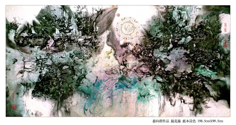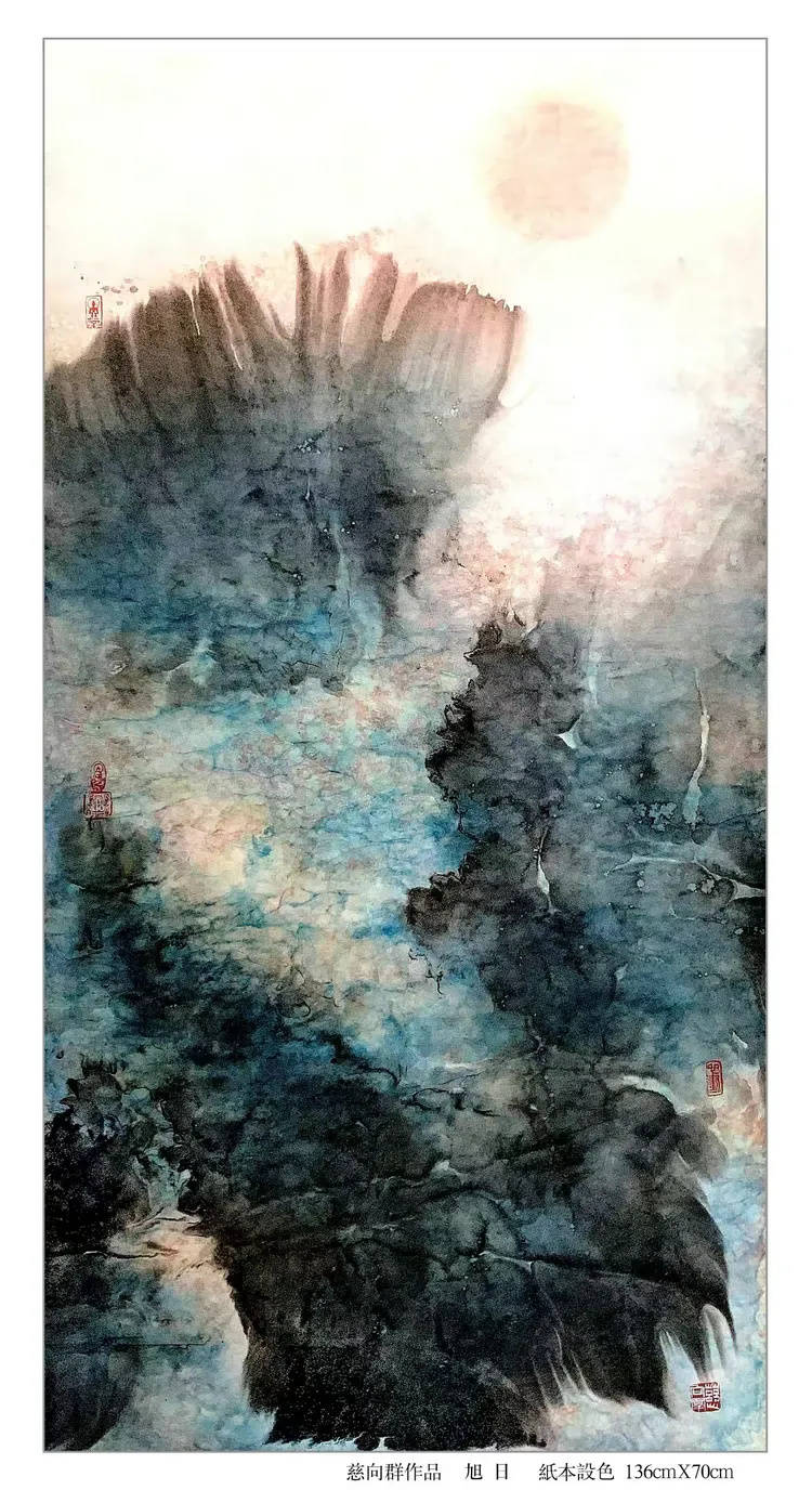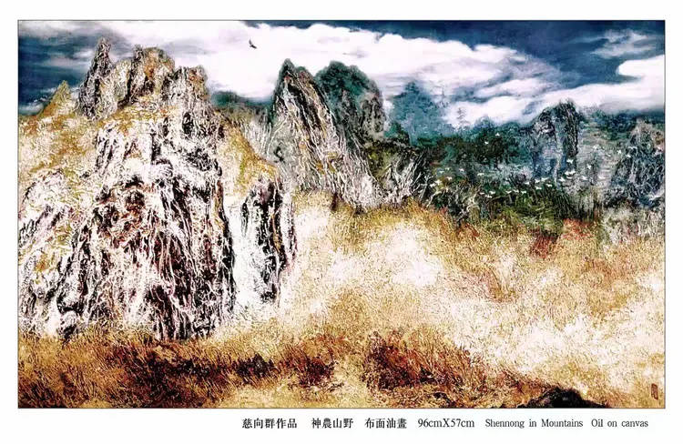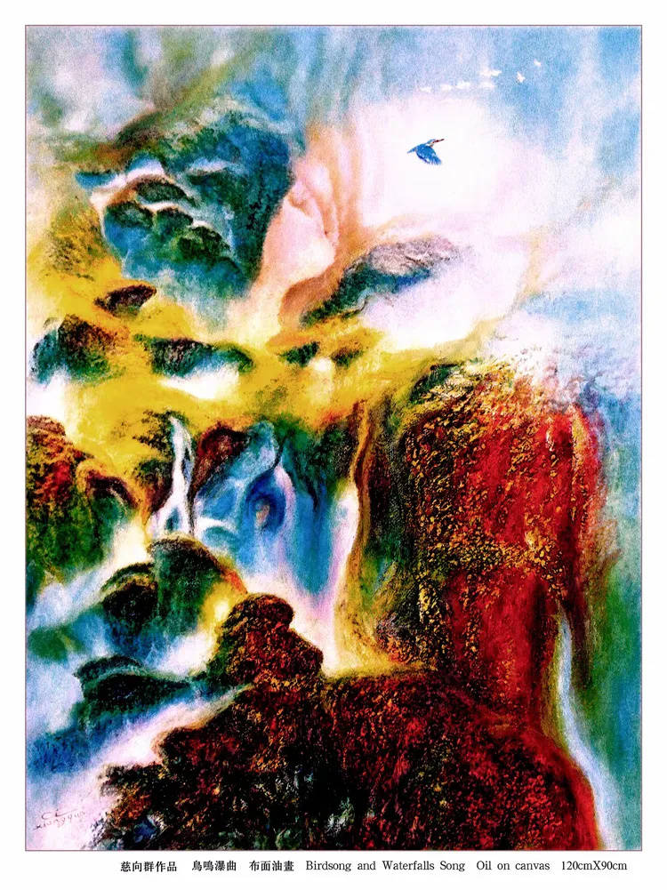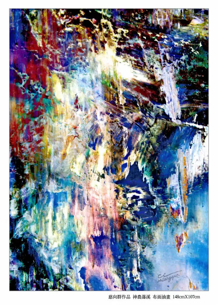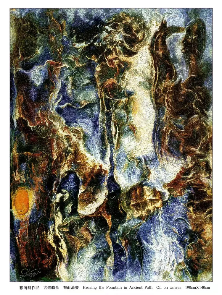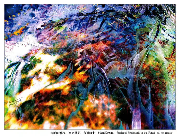 中国画以墨成境,墨因水而得韵,这里面有传承千年的固定法则和思路,并不难成。可是慈向群为什么能把原本凝滞的油彩,泼绘得如云如烟,气韵流畅,甚至韵超水墨?这是什么新法则和新思路,恐怕外人是很难猜透和复现的。也就是说,油彩写意对慈向群来说,是修成之功,可是对外人来说却是秘籍难得。这种油彩生意境的功法,似乎不仅仅是技法之成,还需艺术家具备超凡的想象力,没有天才资分,油彩韵流如云霞的画面神境,是画不出,写不成的。在慈向群的油画里,被注极为精致近乎天才般的意识所得。迷彩成幻,天地奇迹,意识如流,美韵翩翩,天地万物皆因艺术家奇异的意识而得美工奇韵,油画画到这般境界,奇难超越,大功告成,所以说慈向群功成卓著,拥有油画技立峰顶的大家风采!