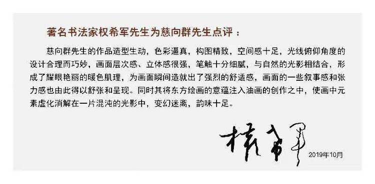 慈向群有着非常敏锐独到的油彩触析能力,他不仅仅是用眼睛分辨色彩,还是在用心区分颜色,颜色在他的谋构下,显得非常有灵逸感,油彩不是呆滞的,具备了生命萌发活跃的品质,色彩无言却能表意,画面因色彩的活泼具备鲜明的对话交流感,观赏这样的油画艺术作品,很容易让人入境,入画境,入心境。