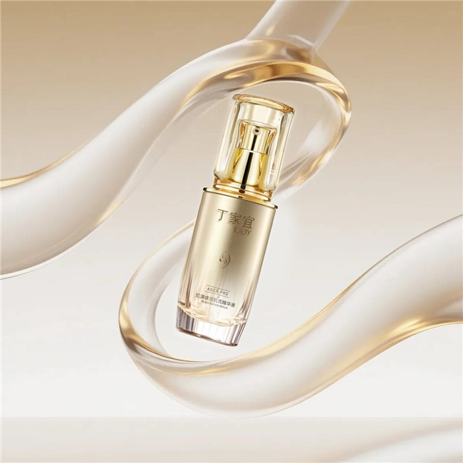 产品瓶身甄选透明玻璃材质,以柔和线条勾勒出简约轮廓,辅以细腻喷砂工艺打造温润哑光质感,于光影流转间尽显东方美学的内敛雅致——不事张扬却暗藏匠心,恰如东方审美中“藏巧于拙”的质感追求。主色调摒弃传统浮夸配色,特选低饱和度的金色调,这抹金色既承续东方美学“藏锋守拙”的低调,更暗合“鎏金驻颜,肌源焕活”的深层寓意,尽显对抗时光的底气与质感。