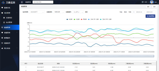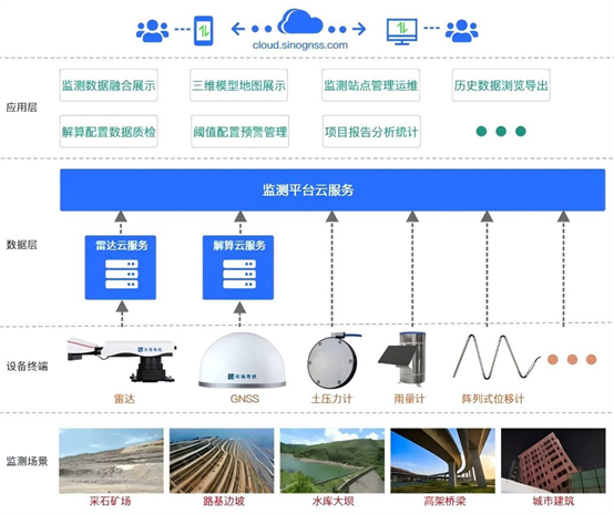 司南导航结合需求研发出信息化监测系统,提供智能化管理及信息可视化的解决方案,可以为不同监测项目的运行状况提供运行数据。同时为各类传统GNSS监测接收机,边坡雷达,多种传感器等监测设备提供数据处理,在线分析、预警等级设置,实时预警等功能。