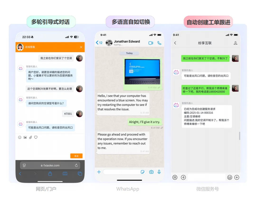 在应对客户问题时,无需人工值守即可解决大量基础重复性问题,像设备开机故障排查、服务进度查询这类咨询,其解决率可达80%,大幅减少了客服人员的重复劳动。