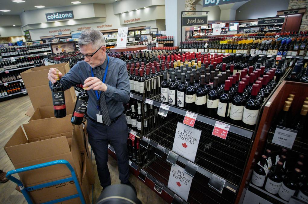 2025年3月10日,在加拿大温哥华,一家不列颠哥伦比亚省酒类专卖店的店员从货架上撤下美国酒类产品。新华社发(梁森摄)