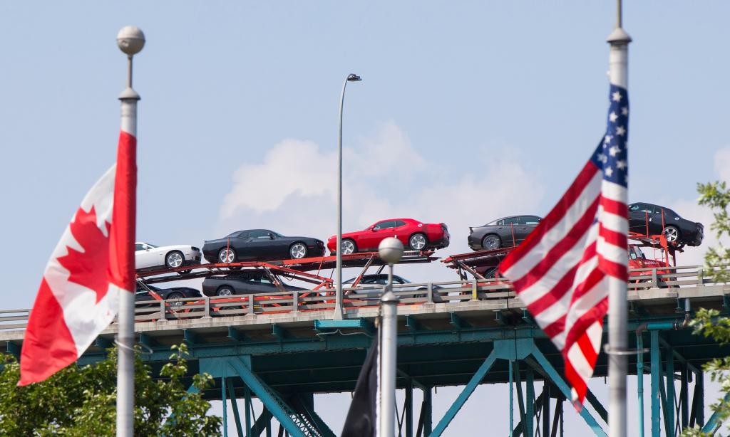 2017年8月16日,在加拿大安大略省温莎市,一辆汽车运输车通过大使桥开往美国。新华社发(邹峥摄)