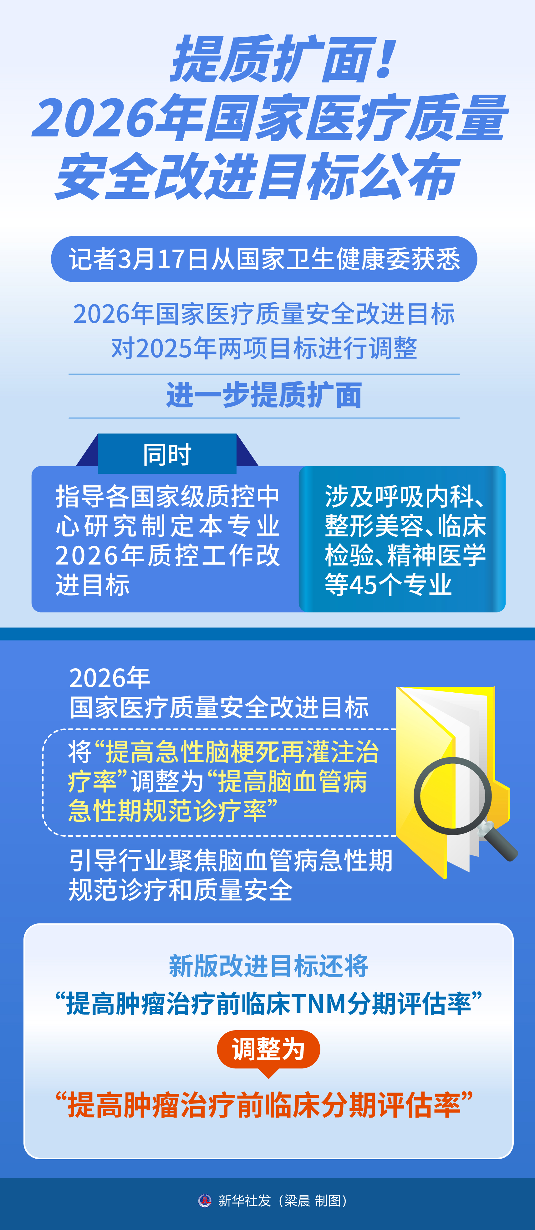 新华社北京3月17日电(记者李恒)记者17日从国家卫生健康委获悉,2026年国家医疗质量安全改进目标对2025年两项目标进行调整,进一步提质扩面。同时,指导各国家级质控中心研究制定本专业2026年质控工作改进目标,涉及呼吸内科、整形美容、临床检验、精神医学等45个专业。
