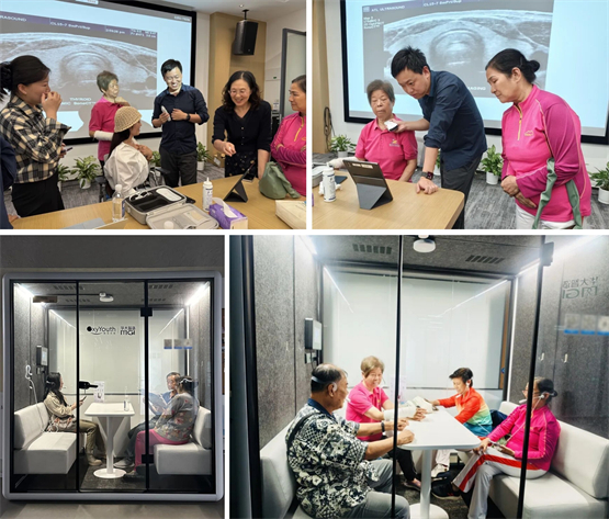 在专业团队的全程手把手指导下,现场嘉宾开启了“亲手观测血管”的实操体验。通过小巧便携的掌上超声设备,嘉宾们亲自尝试在颈部寻找动脉影像,实时观测血管壁厚度、是否有斑块以及血流速度等关键生理指标。随后,大家分批进入专业氧舱,在沉浸式的科技氛围中,亲身感受高压氧微环境对机体循环系统与组织修复的辅助养护作用。