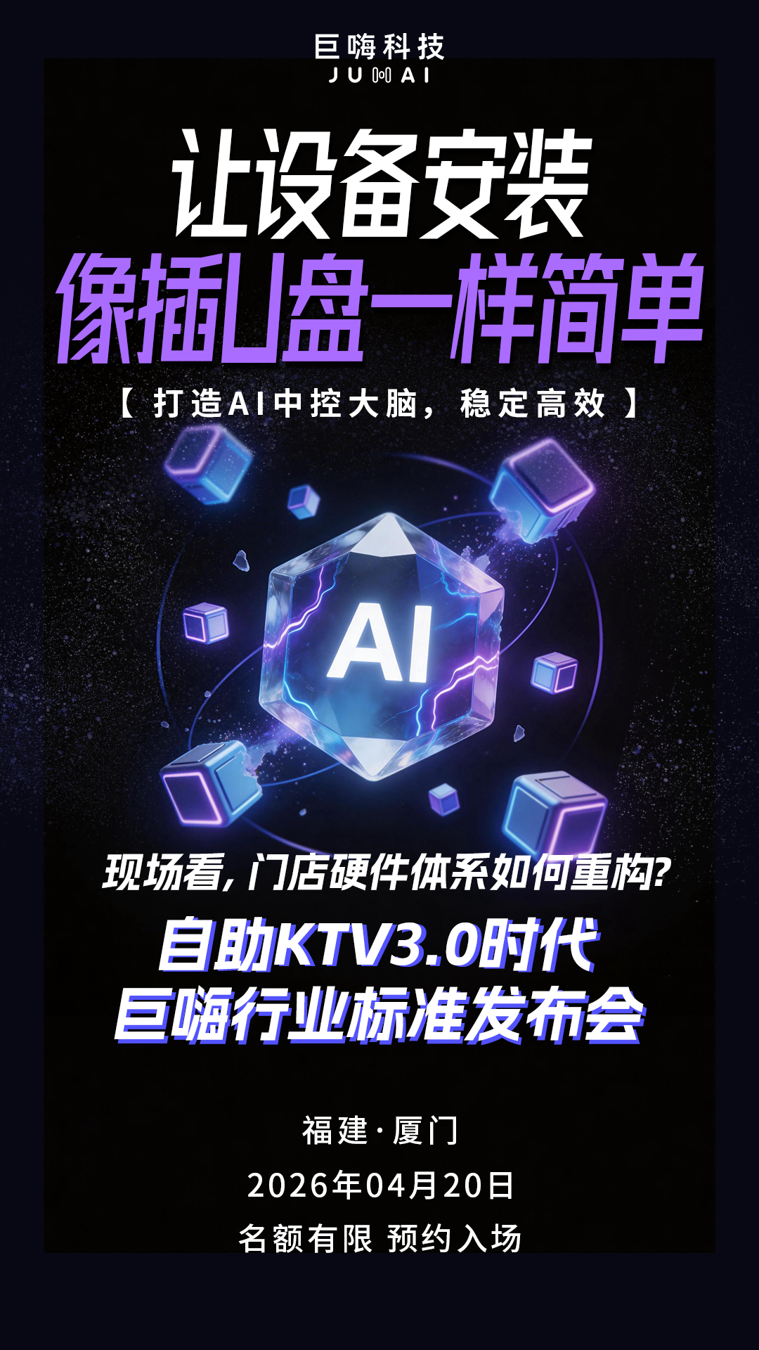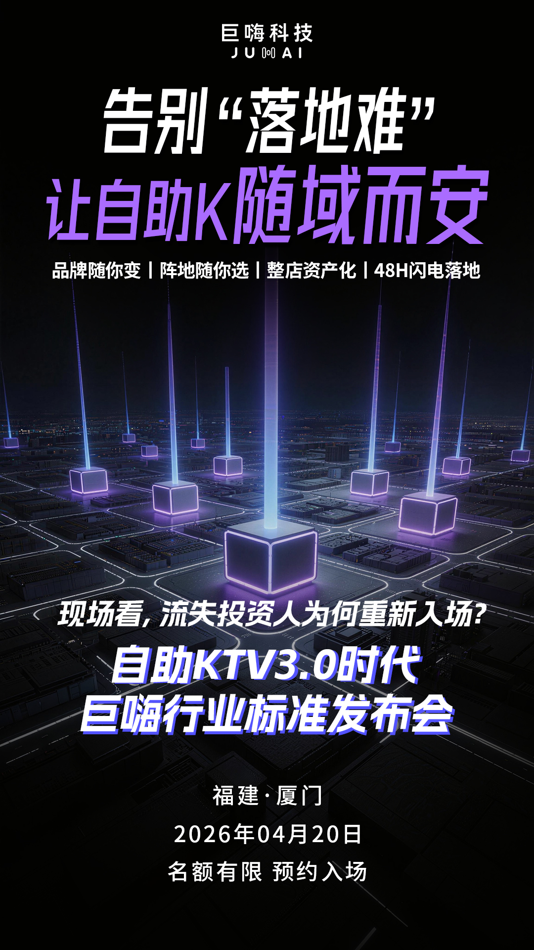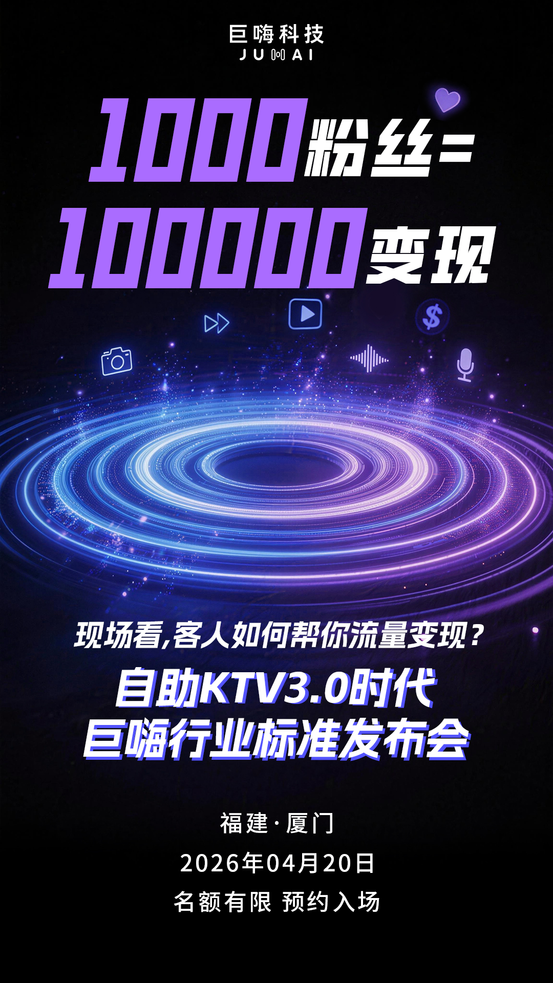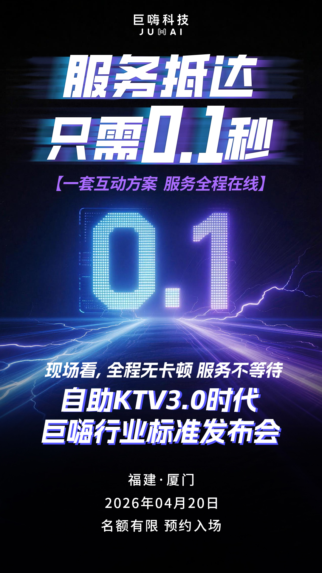 4月20日厦门,自助KTV3.0时代巨嗨行业标准发布会,我们想做的,是把自助KTV 3.0时代的“标准”,用一个个实测数据、一家家落地门店、一套套智能系统——讲给你听。